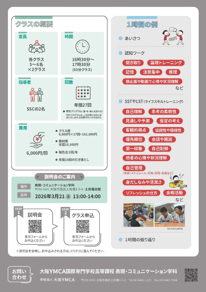 SSCと大阪YMCA国際専門学校 高等課程 表現・コミュニケーション学科(以下、表コミ)が協働で行う「表コミ放課後SSTクラス」が4月から開講されます。指導者はもちろん、SSCの指導者の加藤と裵です。