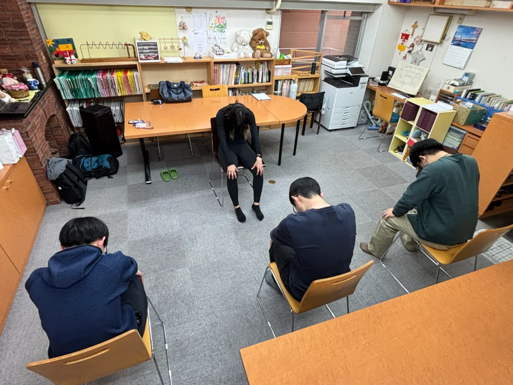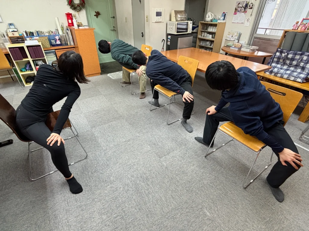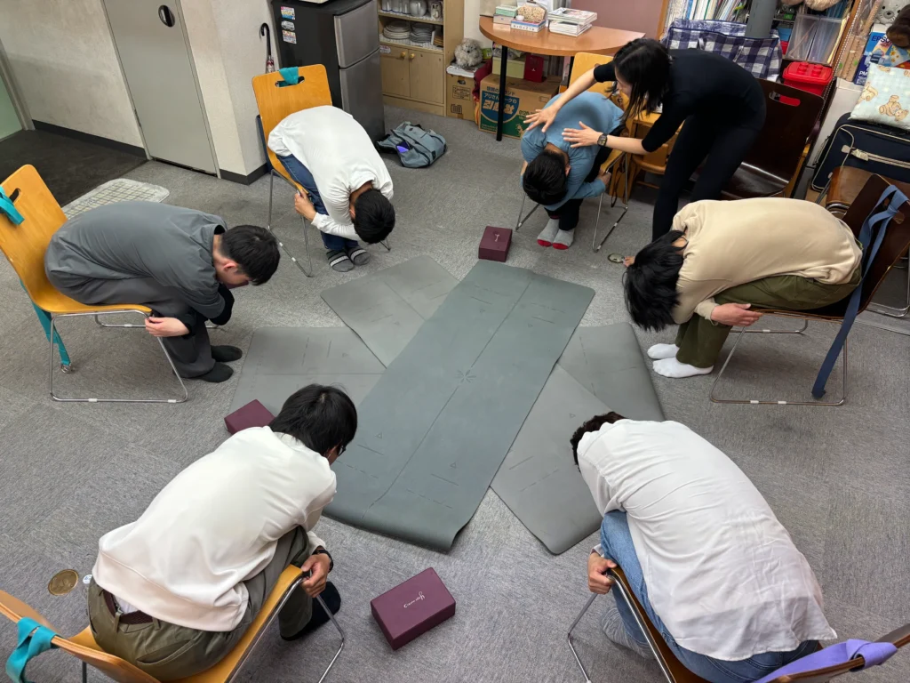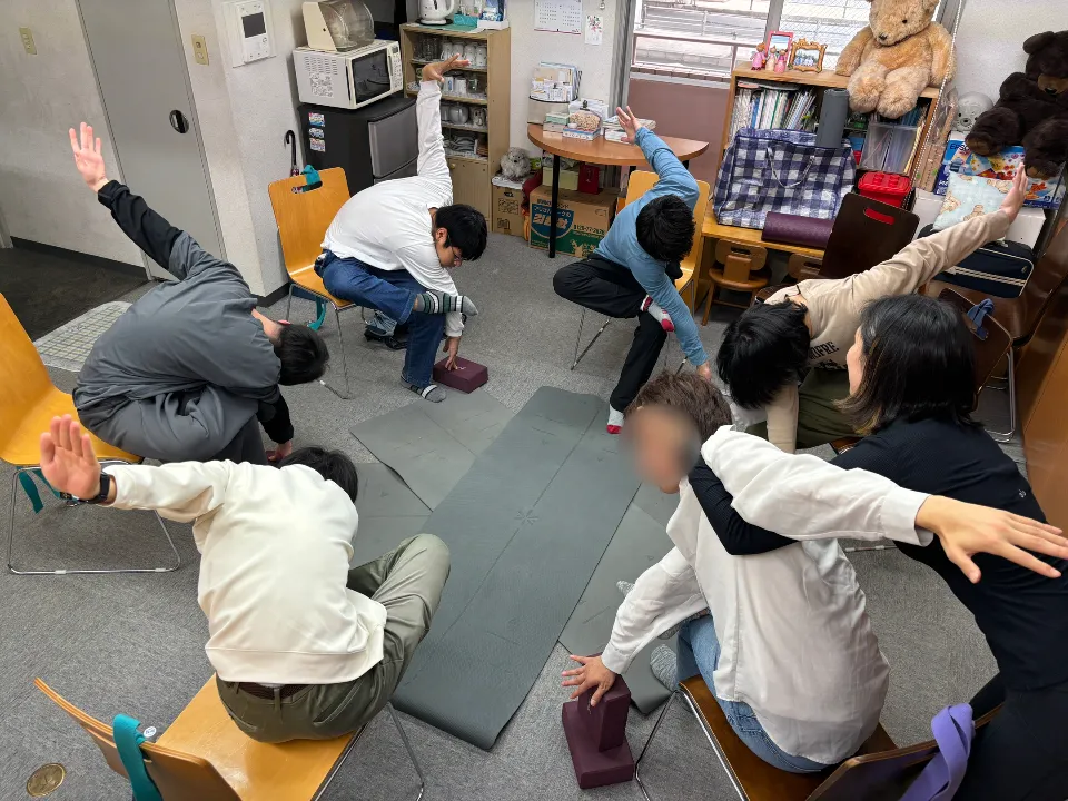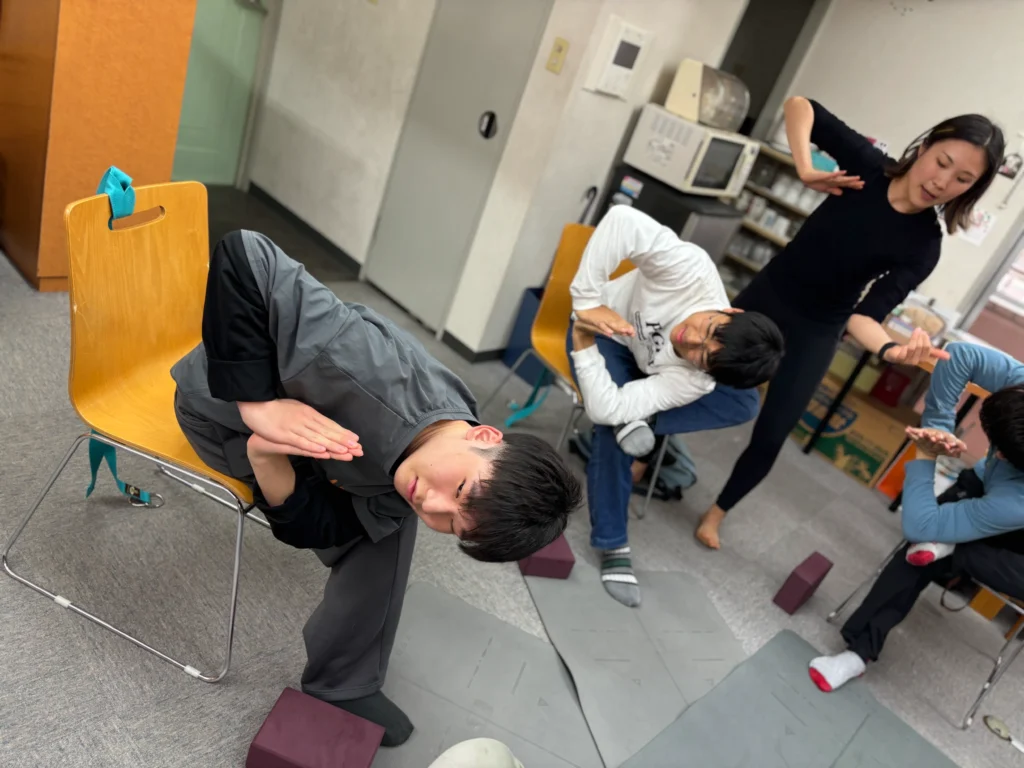 クラスの最初に行うのはヨガです。模倣する力や忍耐力、身体の柔軟性を目的に行います。クラスによっては椅子を使ったチェアヨガを行いました。